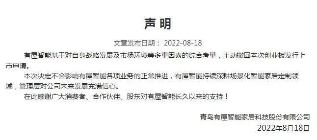 深交所最新消息顯示,青島有屋智能家居科技股份有限公司8月18日已主動(dòng)申請(qǐng)撤回本次創(chuàng)業(yè)板發(fā)行上市申請(qǐng)文件。相關(guān)公告掛網(wǎng)后,有屋智能也于第一時(shí)間發(fā)布聲明表示,“有屋智能基于對(duì)自身戰(zhàn)略發(fā)展及市場(chǎng)環(huán)境等多重因素的綜合考量,主動(dòng)撤回本次創(chuàng)業(yè)板發(fā)行上市申請(qǐng)。本次決定不會(huì)影響有屋智能各項(xiàng)業(yè)務(wù)的正常推進(jìn),有屋智能持續(xù)深耕場(chǎng)景化智能家居定制領(lǐng)域,管理層對(duì)公司未來(lái)發(fā)展充滿信心。”