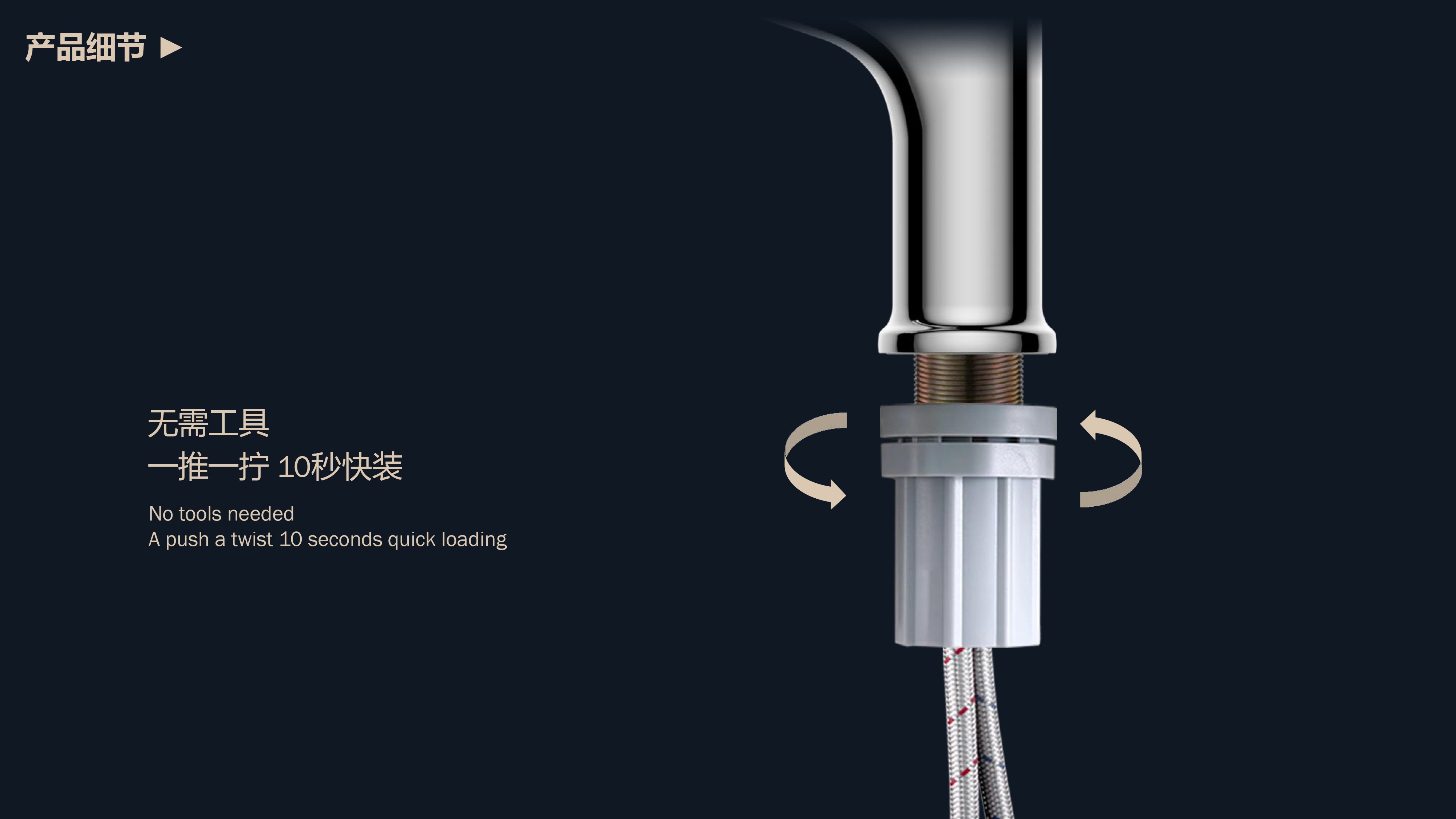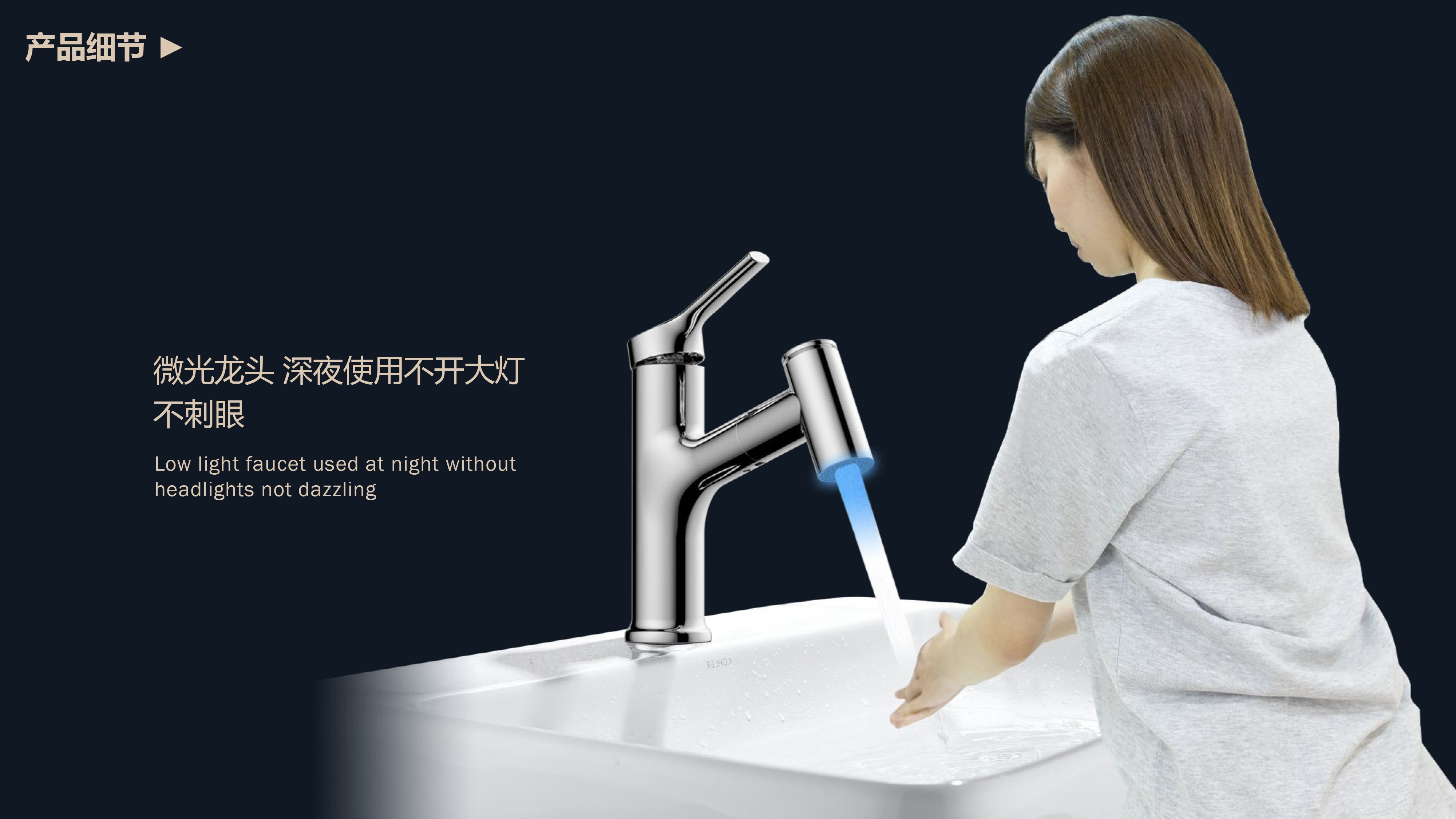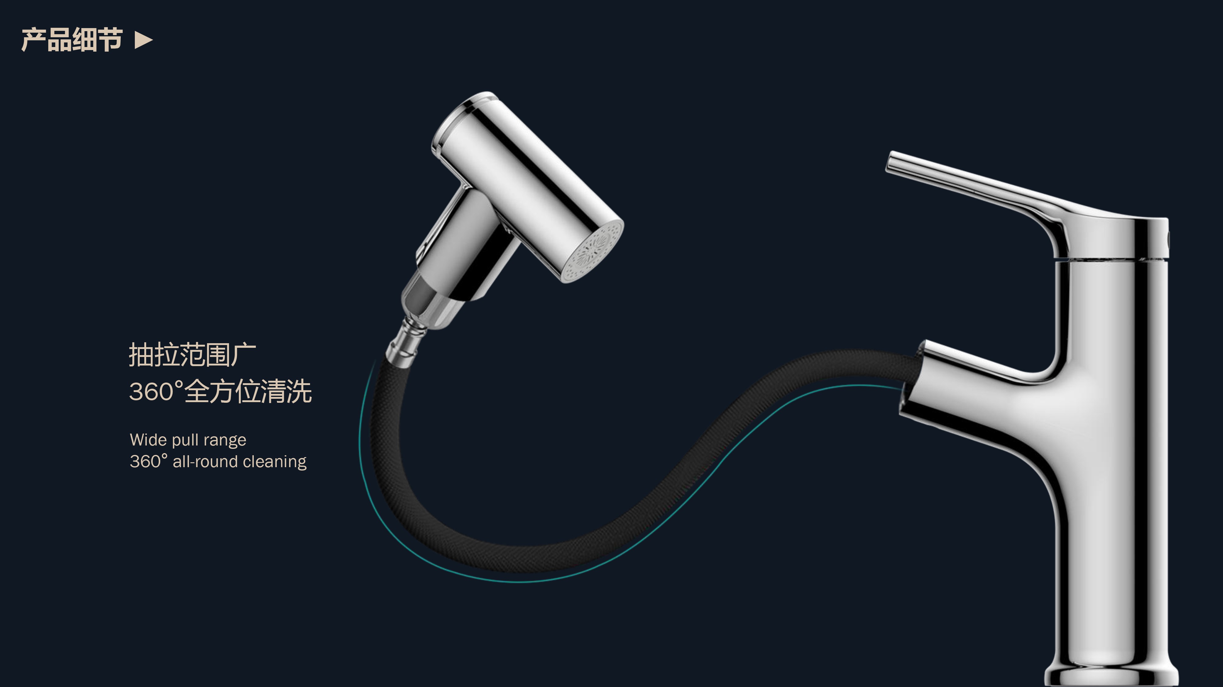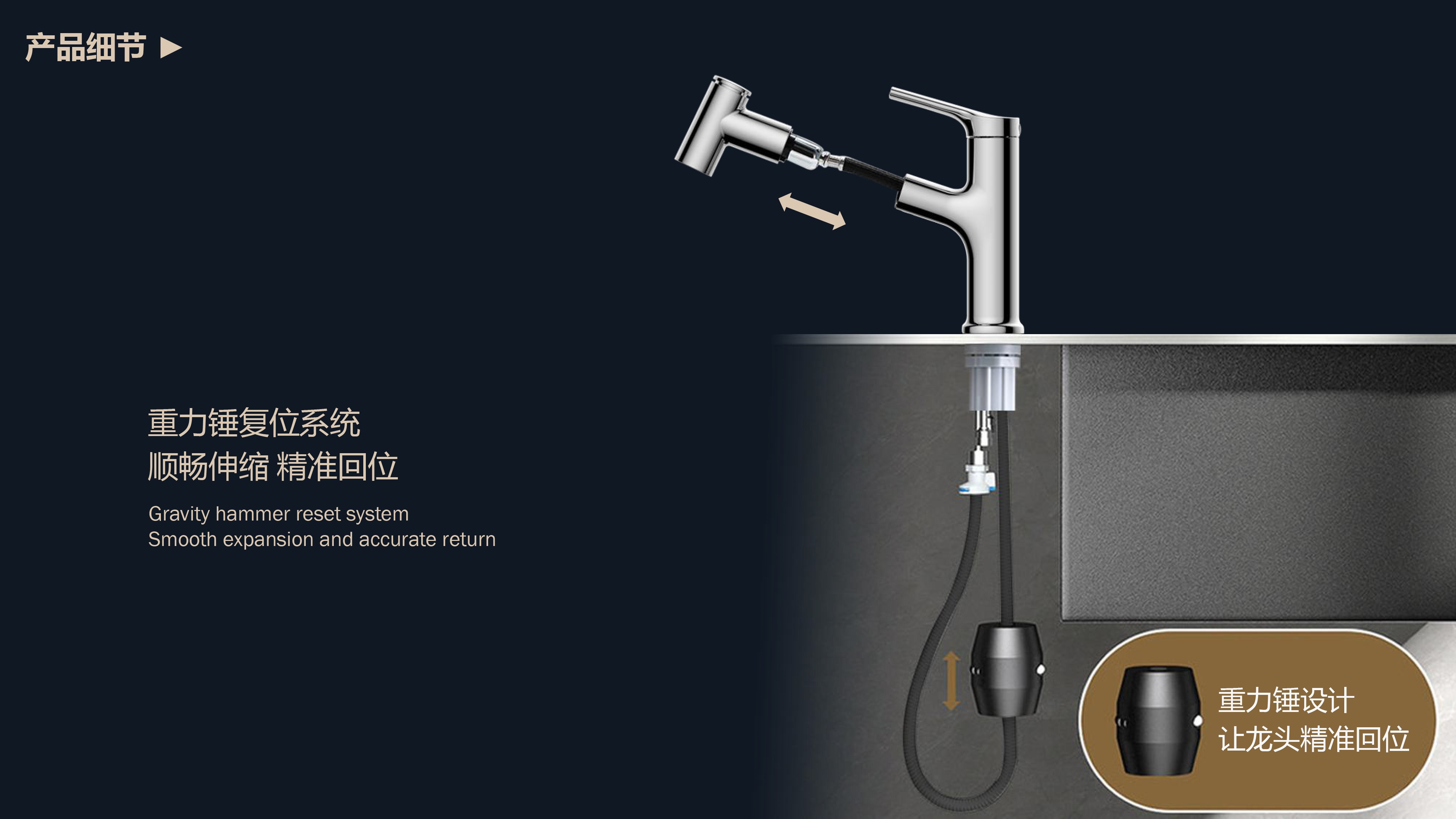 360°全方位抽拉清洗;微光龍頭,深夜使用不開大燈,不刺眼;日常洗頭利器,抽拉出水輕松洗;按壓切換兩功能水花;三種顏色LED燈光顯示水溫;重力錘復(fù)位設(shè)計(jì),順暢伸縮,精準(zhǔn)回位;無(wú)需工具,一推一擰10秒快裝