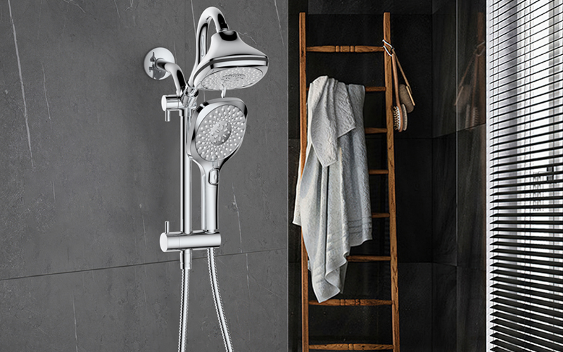 Upper water outlet elbow suit; The top spray has a built-in ball head, which can realize multi-angle rotation adjustment; Switch the handle to top spray water and shower water; Turn the handle to adjust the height of the sliding seat; 8-function water outlet shower