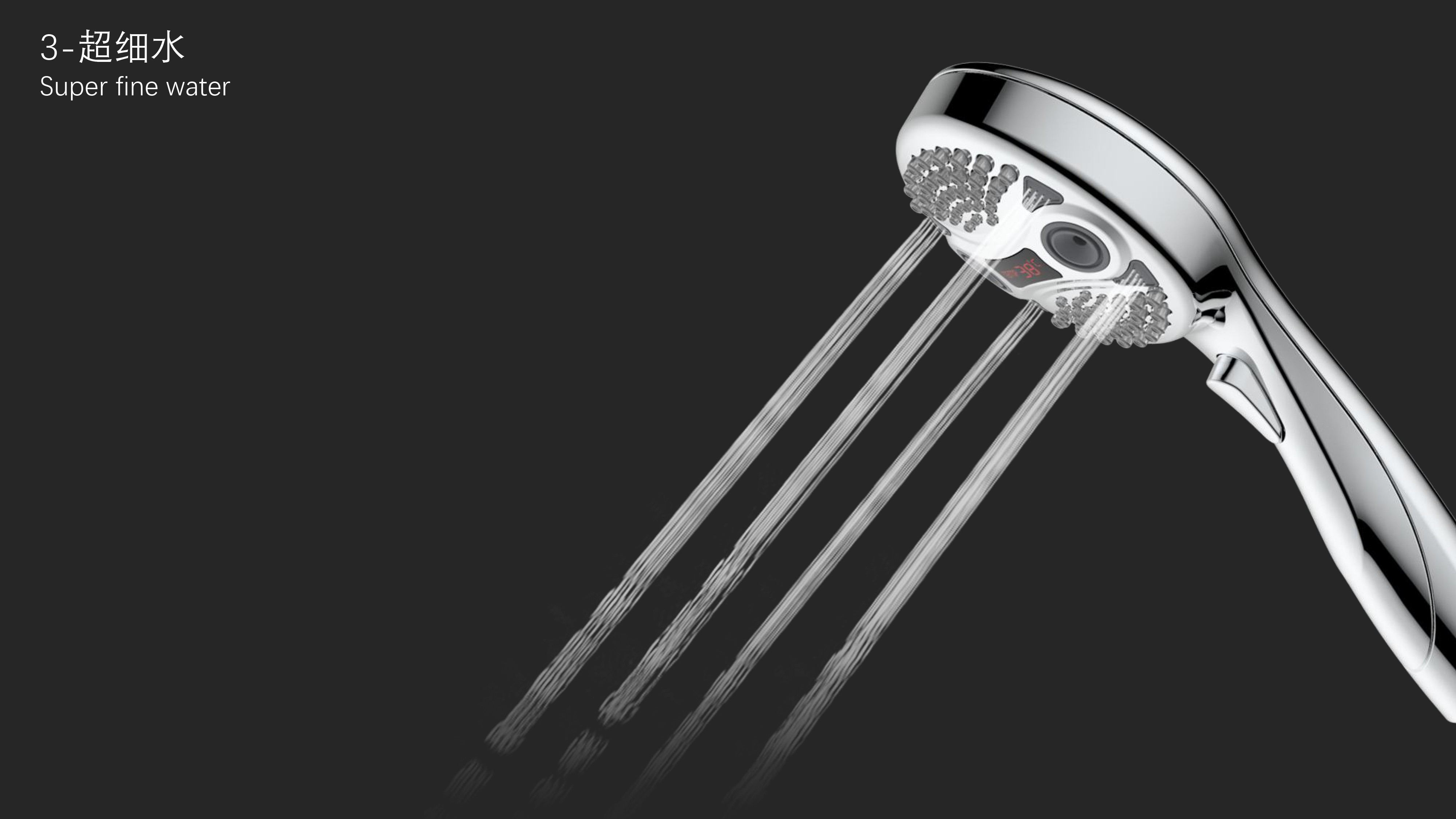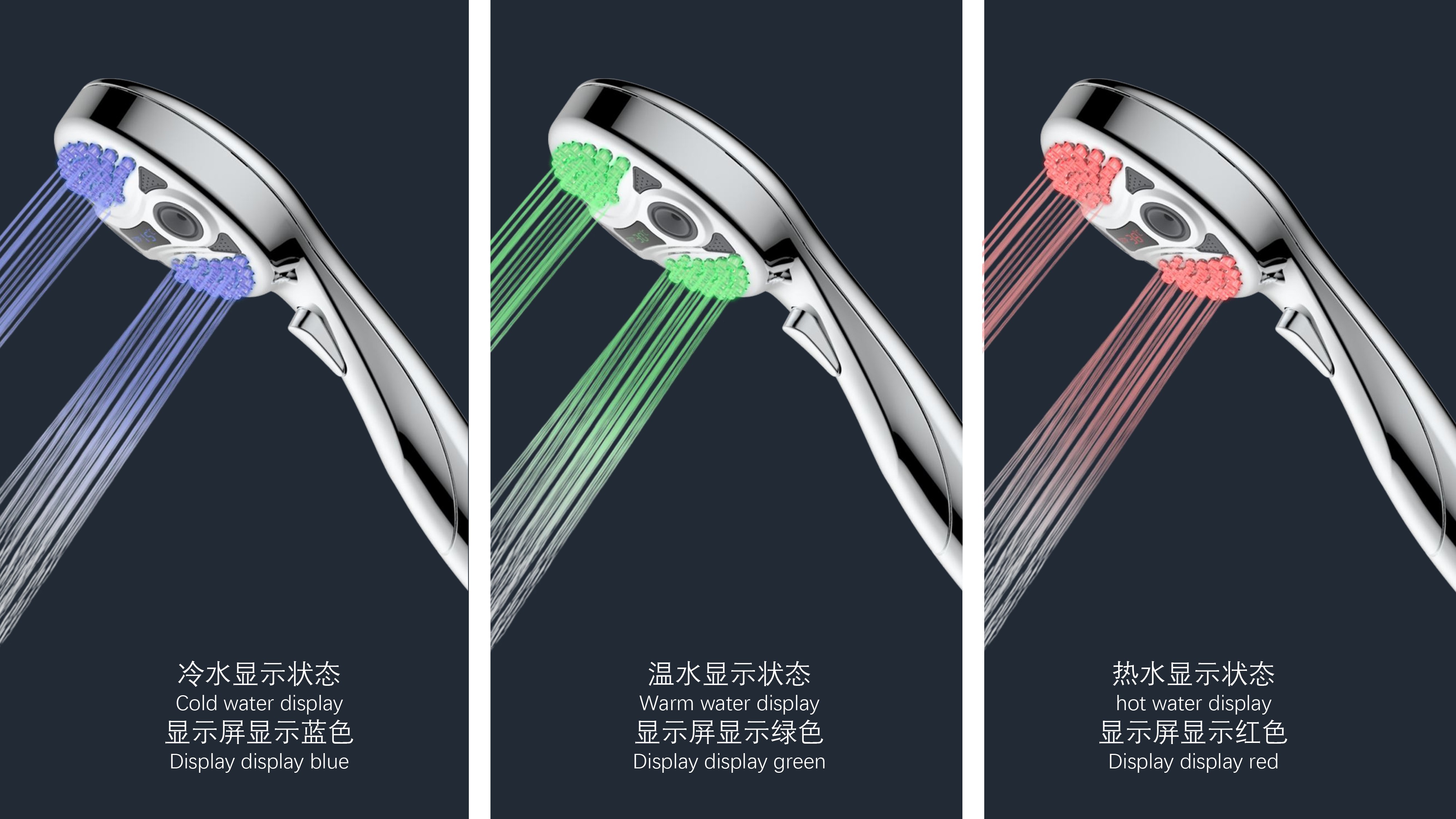 三功能溫顯花灑;獨特E.T.外觀設計;TPR出水孔,輕撥除垢;LED三色出水,看得見的水溫;按鍵切換三檔模式出水;握感舒適防滑